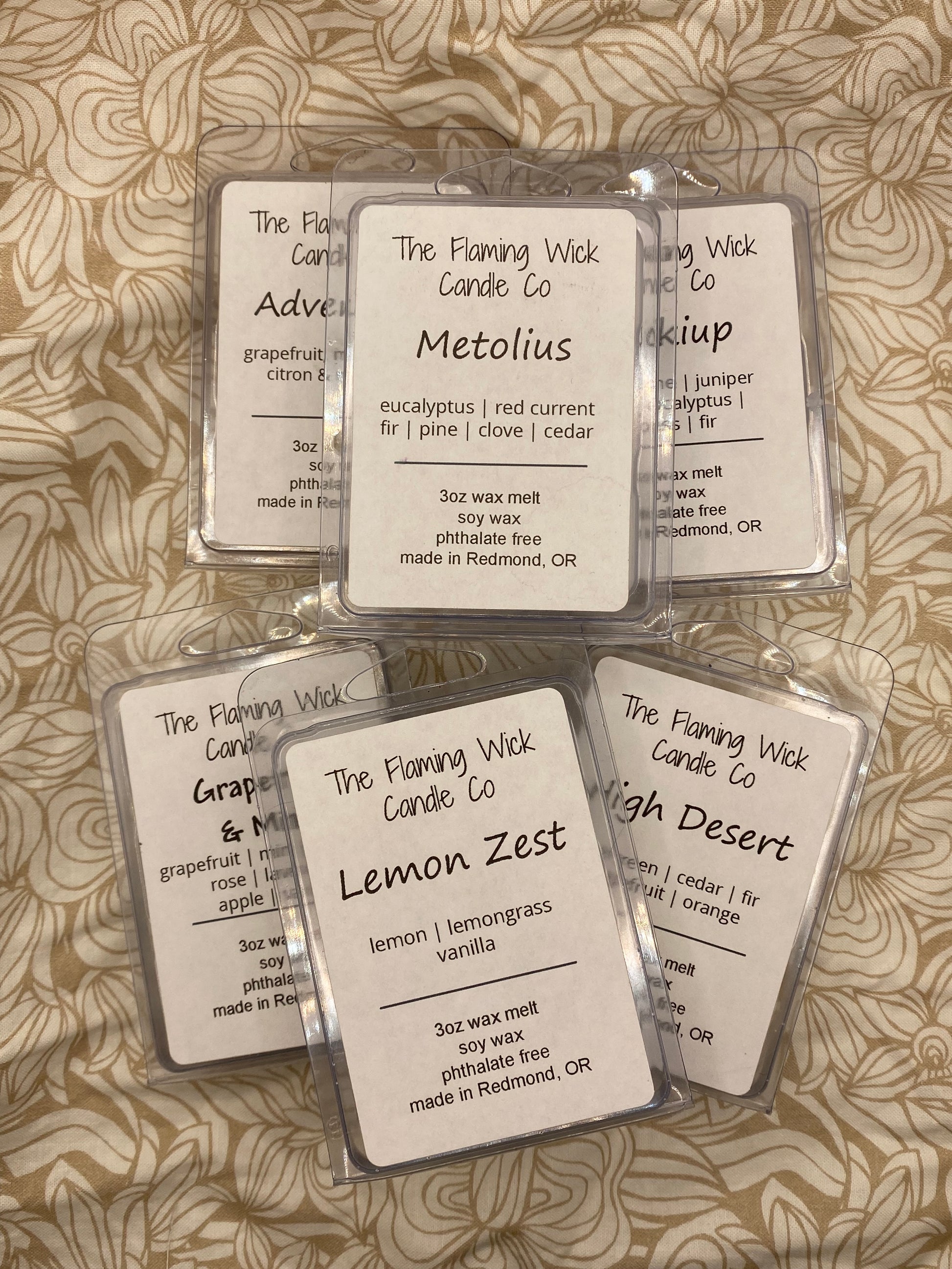 All wax melts are made of 100% US grown soy wax and hand poured using non-toxic phthalate free fragrance oils.